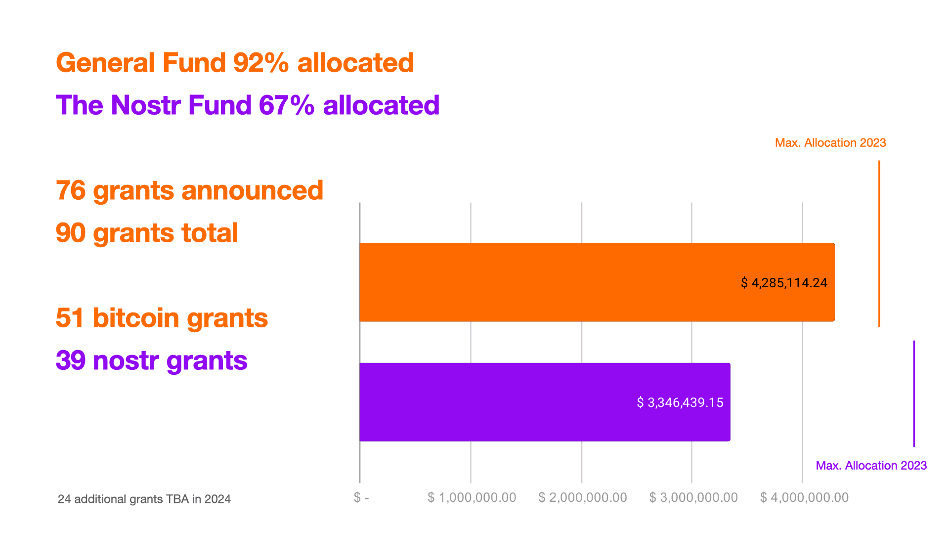 Our General Fund is almost fully allocated as of this writing, with ~$4.8M donations received in 2023 and ~$4.3M allocated. The Nostr Fund is on track to be fully allocated by the end of Q1 2024, with ~$3.4M out of $5M going towards a variety of free and open-source projects in the nostr ecosystem as of this writing.