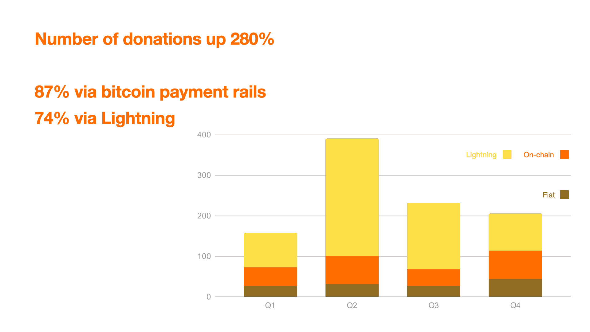 Of the 87% of donations received via bitcoin payment rails, 74% of the donations in 2023 were made via Lightning.