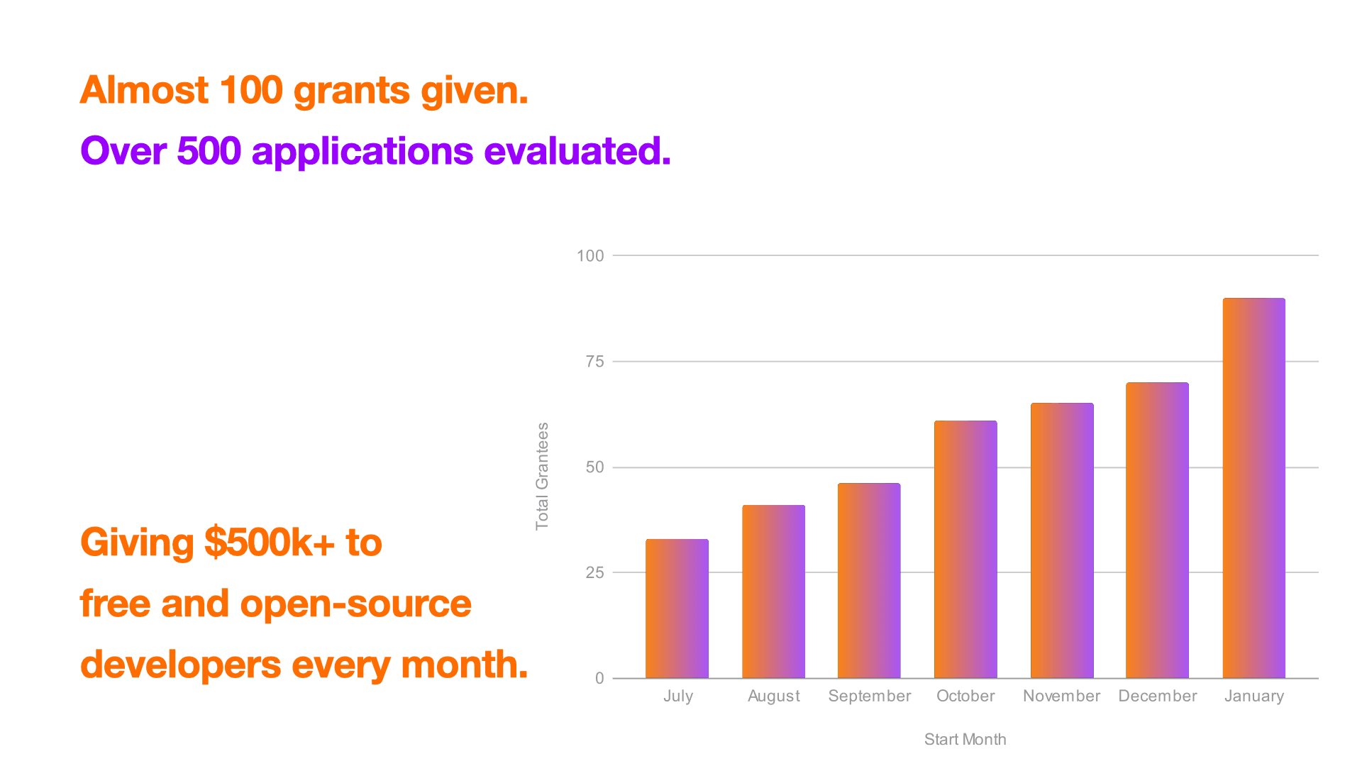 After the initial wave of grants announced in July, we’ve added around 10 grantees each month on average, totaling 90 approved grants as of this writing (not all of them announced yet).